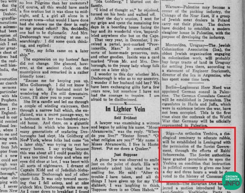 In a breaking release, a newspaper clipping has been discovered showing that the Frierdiker Rebbe opened a Yeshiva in 1925 in Leningrad with the government’s permission. As part of the agreement with the government, he agreed to teach communism at the Yeshiva for three hours a week. If communism was actually taught is not known.