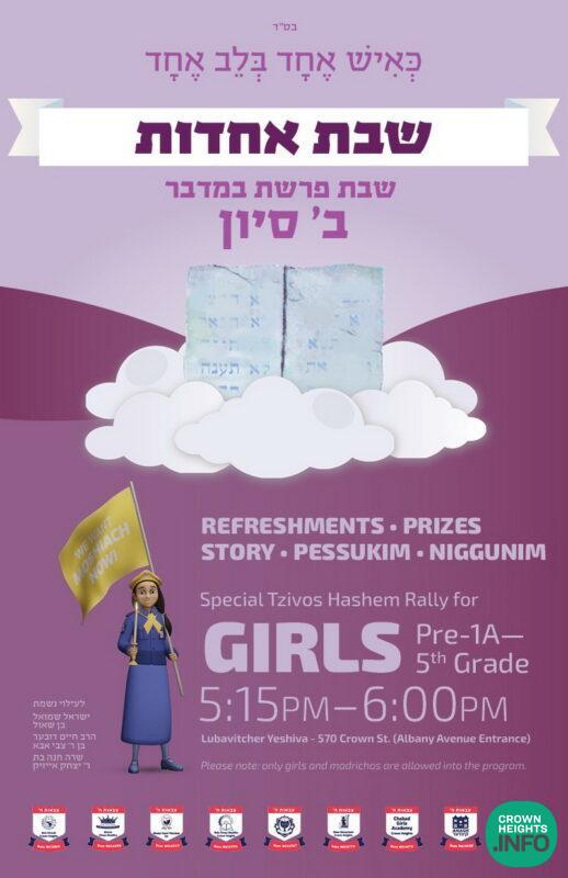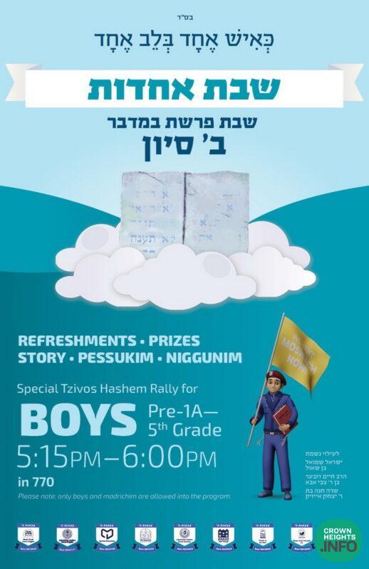 Join the childrens’ Achdus gatherings, for children in Pre 1A – 5th Grade, b’ezras Hashem this Shabbos, Beis SIvan!