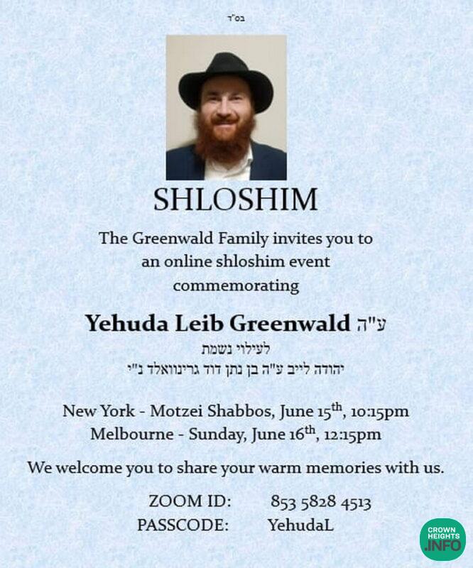 An online Shloshim event will take place this Motzei Shabbos in honor of Yehuda Leib Ben Nosson Dovid Greewald OB”M. The event will be broadcast LIVE on Zoom.
