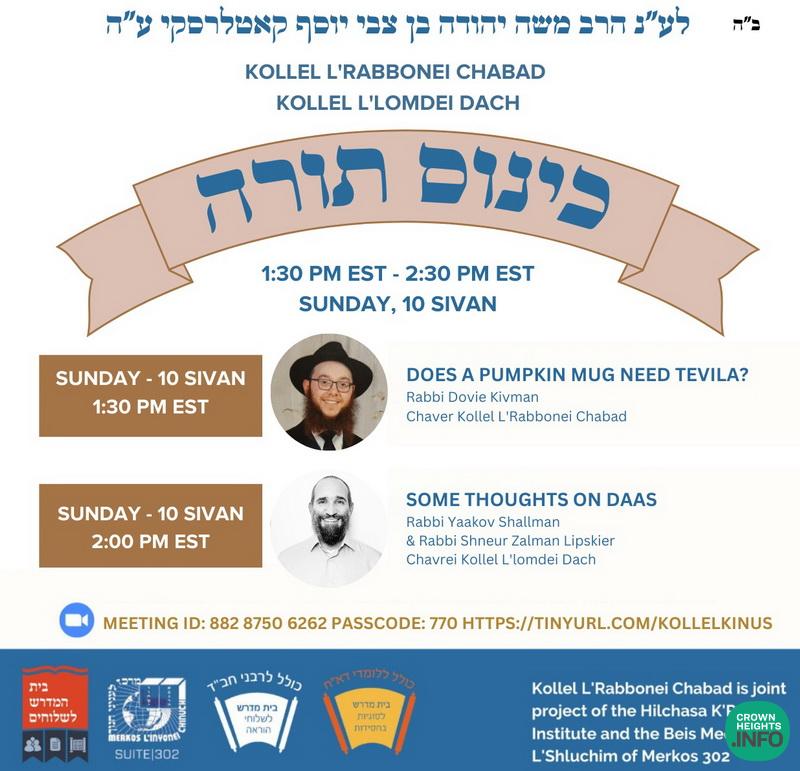 As per the הוראה of the Rebbe, Bezras Hashem there will be a joint kinnus Torah Today, Sunday from 1:30-2:30 pm EST, between Kollel L’Rabbonei Chabad and Kollel L’lomdei Dach.