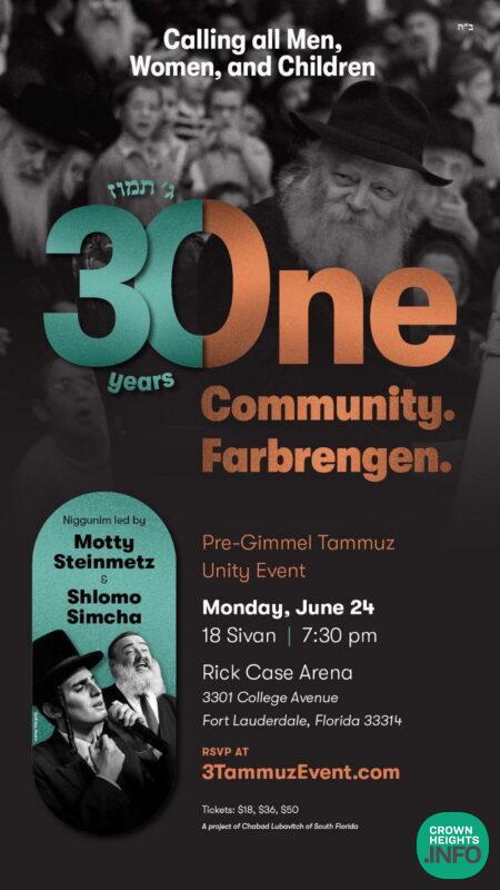 With less than 30 days to Gimmel Tammuz and right before the Yom Tov of Shavuos, a group of Shluchim decided to make a beautiful event the likes of which Florida has never seen. In the Rick Case Arena next Monday night over 4,000 men, women and children will gather to be inspired by the Rebbe’s ongoing impact in our lives and the whole world.