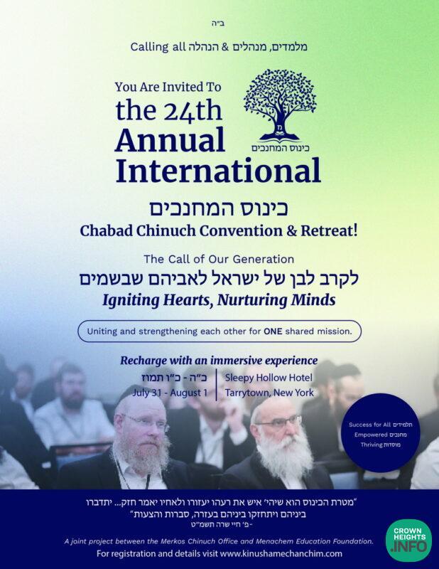 The dates and location for this year’s much-anticipated Kinus HaMechanchim have finally been revealed. Scheduled for כ”ה – כ”ו תמוז, July 31st – August 1st, the event will be hosted at the picturesque Sleepy Hollow Hotel in Tarrytown, New York, just 1 hour north of Crown Heights. Organized for the first time as a collaboration between the Merkos Chinuch Office and the Menachem Education Foundation, this year’s Kinus promises to be a landmark event under the theme, “לקרב לבן של ישראל לאביהם שבשמים – Igniting Hearts, Nurturing Minds,” focusing on our sacred Shlichus of deepening our students’ relationships with Hashem.