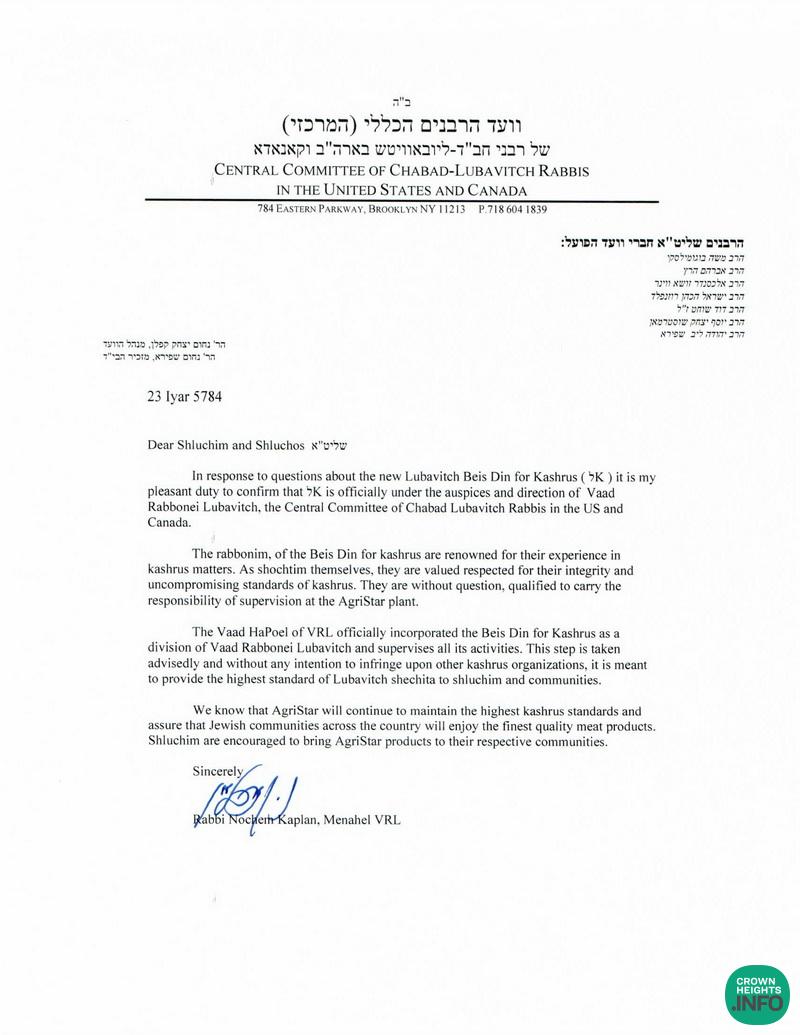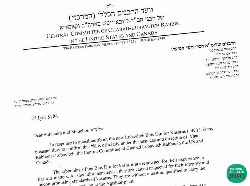 Vaad Rabbonei Lubavitch has announced in a recent letter to Shluchim that the new Beis Din for Kashrus is now operating under its auspices. The letter encourages Shluchim and Shluchos to bring Shor Habor AgriStar products to their respective communities.