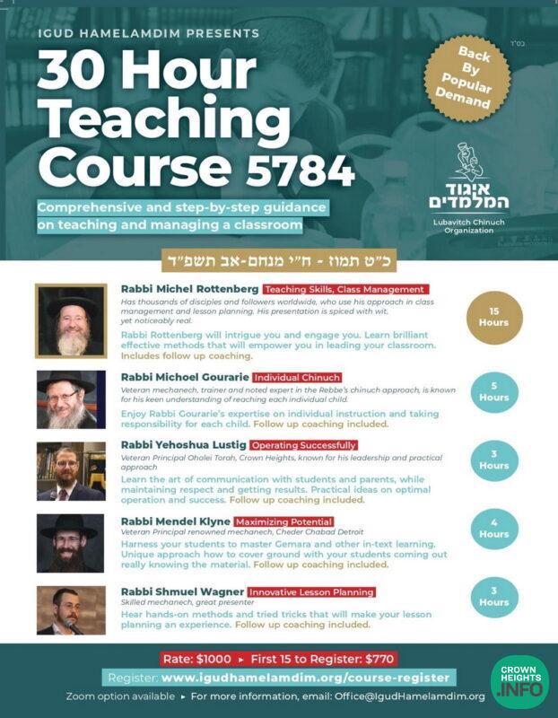 The course will be led by renowned Mechanech Rabbi Mechel Rottenberg, who brings over 30 years of experience and expertise. This year’s notable educators include Rabbi Shmuel Wagner on “Innovative Lesson Planning,” Rabbi Michoel Gourarie on “Individualized Chinuch,” Rabbi Yehosha Lustig on effective parent-teacher communication, and Rabbi Mendel Klyne on maximizing student potential.