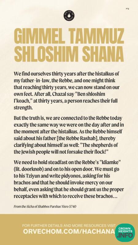 “We find ourselves thirty years after the histalkus of my father-in-law, the Rebbe, and one might think that reaching thirty years, we can now stand on our own feet. After all, Chazal say “Ben shloshim I’koach,” at thirty years, a person reaches their full strength. But the truth is, we are connected to the Rebbe today exactly the same way we were on the day after and in the moment after the histalkus. As the Rebbe himself said about his father [the Rebbe Rashab], thereby clarifying about himself as well: “The shepherds of the Jewish people will not forsake their flock!” We need to hold steadfast on the Rebbe’s “kliamke” (lit. doorknob) and on to his open door. We must go to his Tziyun and write pidyonos, asking for his brachos and that he should invoke mercy on our behalf, even asking that he should grant us the proper receptacles with which to receive these brachos…”