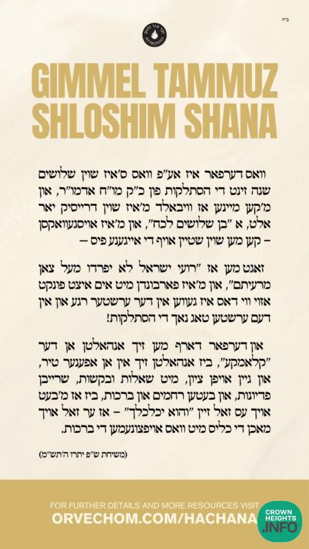 Download a full Kovetz of Sichos related to Shloshim Shana in general and specifically in connection with the day of the Hilulo at OrVechom.com/Kovetz.