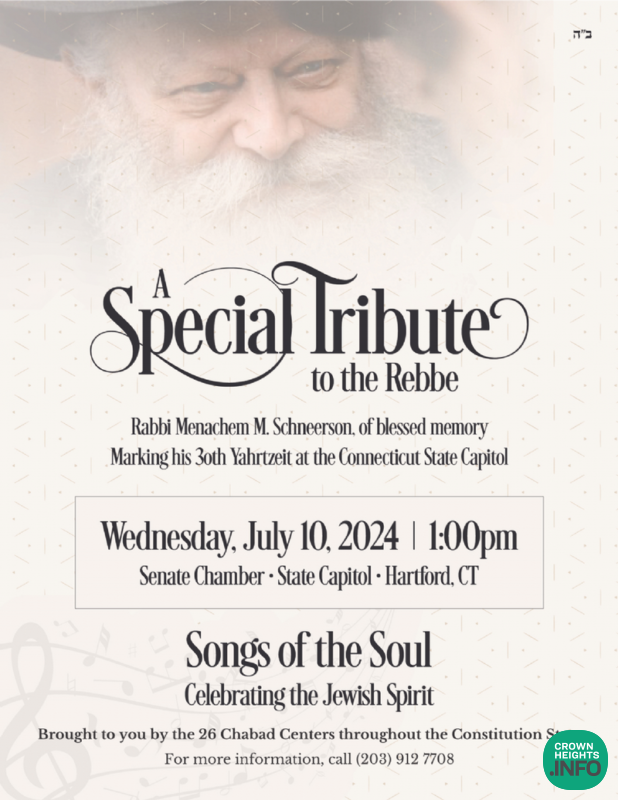 Next Wednesday, July 10 at 1:00pm, a special Tribute to the Rebbe will be held at the Connecticut Senate Chamber in the State Capitol of Hartford. The afternoon, marking the 30th Yahrtzeit of the Rebbe, is sure to be informative and inspiring.