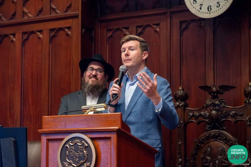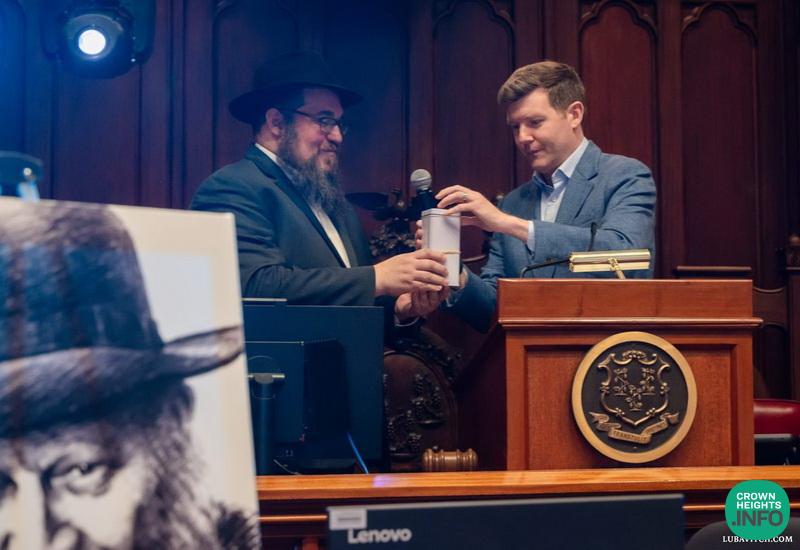 “The Rebbe taught that each one of us can make a positive impact on the world around us,” State Comptroller Sean Scanlon said as he led the assembled in a charity-giving ceremony. “We need the Rebbe’s message now, more than ever.”