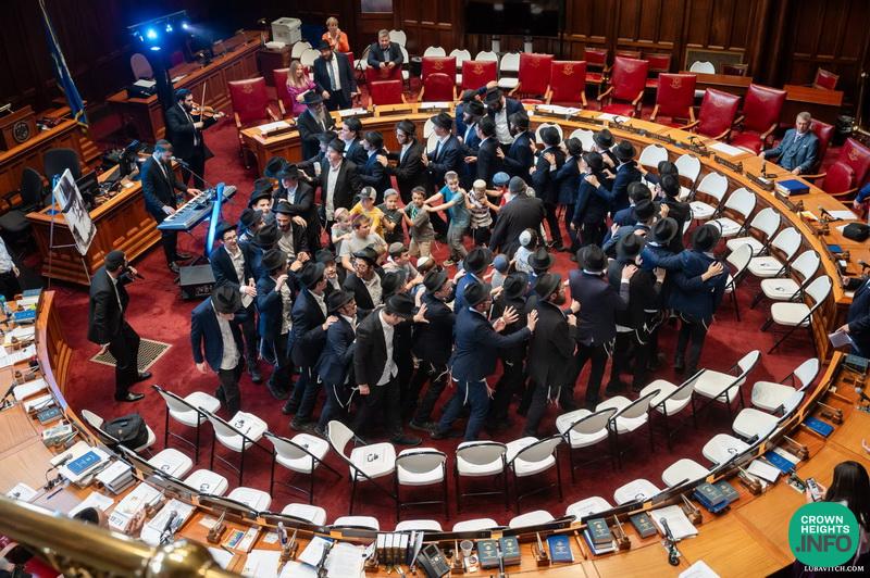 A highlight of the event was “Songs of the Soul,” a live rendition of the niggunim—chassidic melodies—taught by the Rebbe. The state’s Chabad rabbis—joined by students from the state’s Jewish schools and yeshivas—gathered on the Senate Floor for a lively chassidic dance.