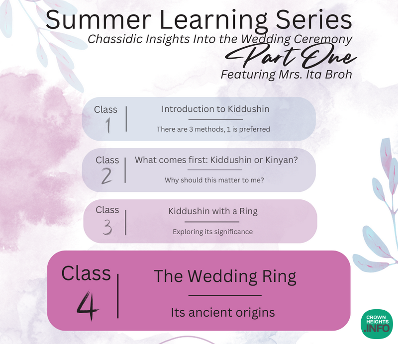 Tune in to the fourth class in our Summer Learning Series, where we explore Chassidic insights into the Wedding Ceremony. This class, featuring Mrs. Ita Broh, is the final episode of Part One. In this episode, we delve into the ancient origins of the wedding ring.