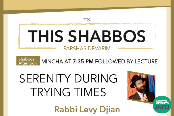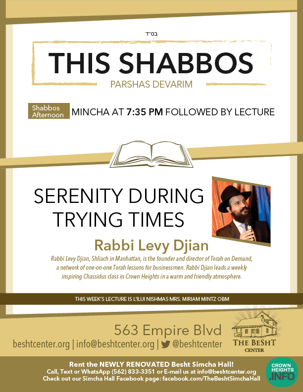 Shabbos at the BESHT: Rabbi Levy Djian, Shliach in Manhattan, is the founder and Director of Torah on Demand, a network of one-on-one Torah lessons for businessmen. His passion and love for learning brought him to lead a weekly Chassidus class in Crown Heights that inspires many. He will be giving this week’s shiur on Serenity during trying times.
