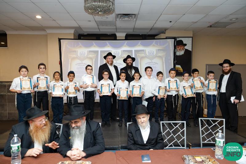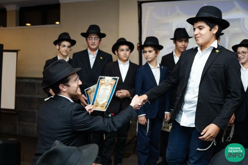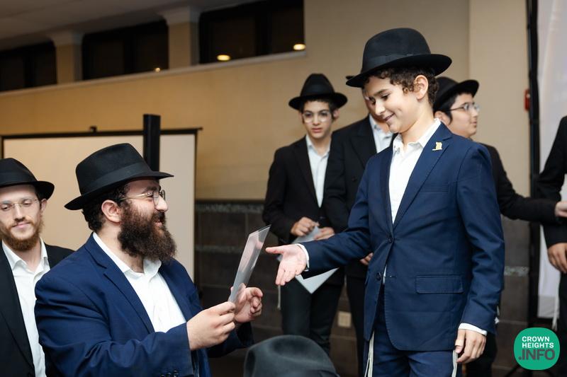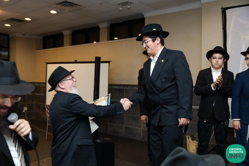 Rabbi Yossef Overlander , vice principal, awarded special Seforim vouchers to students who excelled in Mishnayos Baal Peh. The Menahel presented each student with a beautiful Cheder “Mincha Maariv” gift, thanking Hashem publicly for the privilege of working with a unique and special team of educators. He also thanked the event producers, Rabbi Avrohom Rainitz , Rabbi Chanoch Hecht , and Reb Shlomo Frishman .