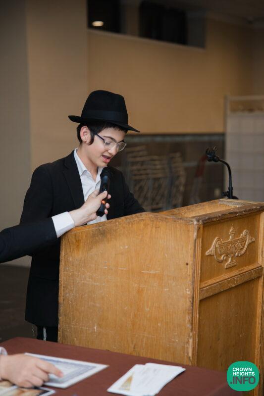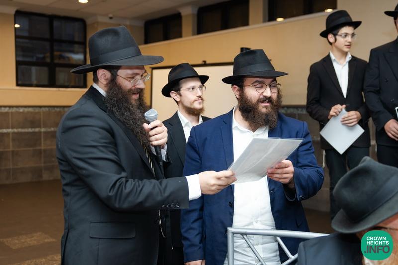 The first group, Kita Daled, led by Rabbi Dovber Bryski , recited the 12 pesukim and Maamorei Razal selected by the Rebbe for every student to know and review regularly. Next, the students of Kita Hey, with their Melamedim Rabbi Levi Belinov and Rabbi Yisroel Noach Blank , and Kita Vov, with Rabbi Yisroel Botnick and Rabbi Levi Shuchat , were applauded for memorizing all 12 Perokim Tanya!