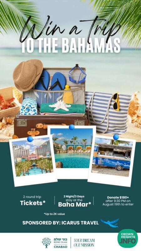 As Bonei Olam Chabad hits its final stretch towards its fundraising goal, a raffle has been launched for a trip for 2 – for 2 nights and 3 days – in Bahamar, Bahamas for any donation of $180 or more.