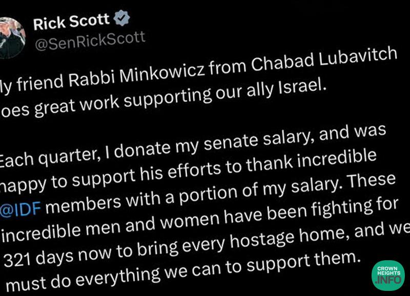 United States Senator Rick Scott, a strong supporter of Israel who traveled to Israel after October 7th to show his support, posted on X today revealing that he donates from his senate salary to Rabbi Yitzchok Minkowicz of Chabad of Southwest Florida.