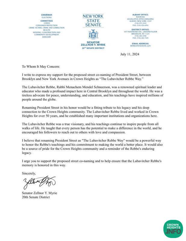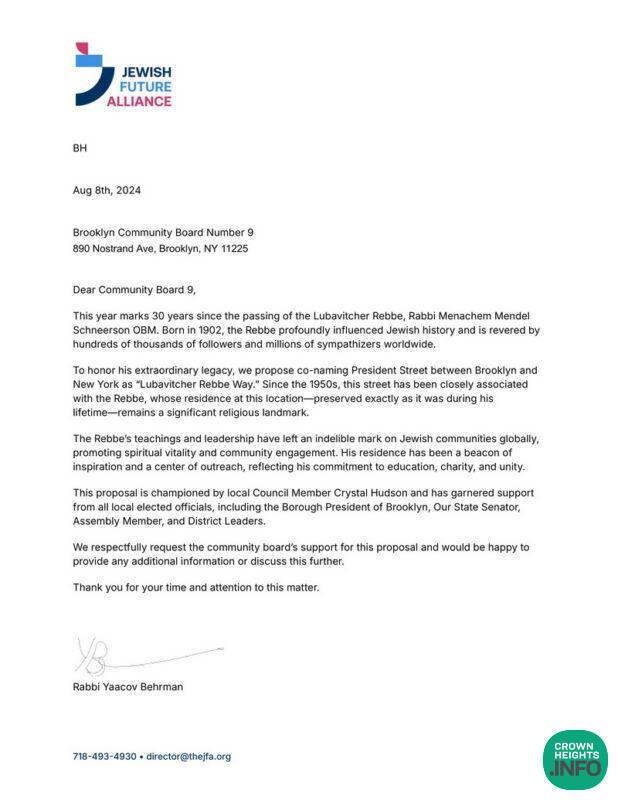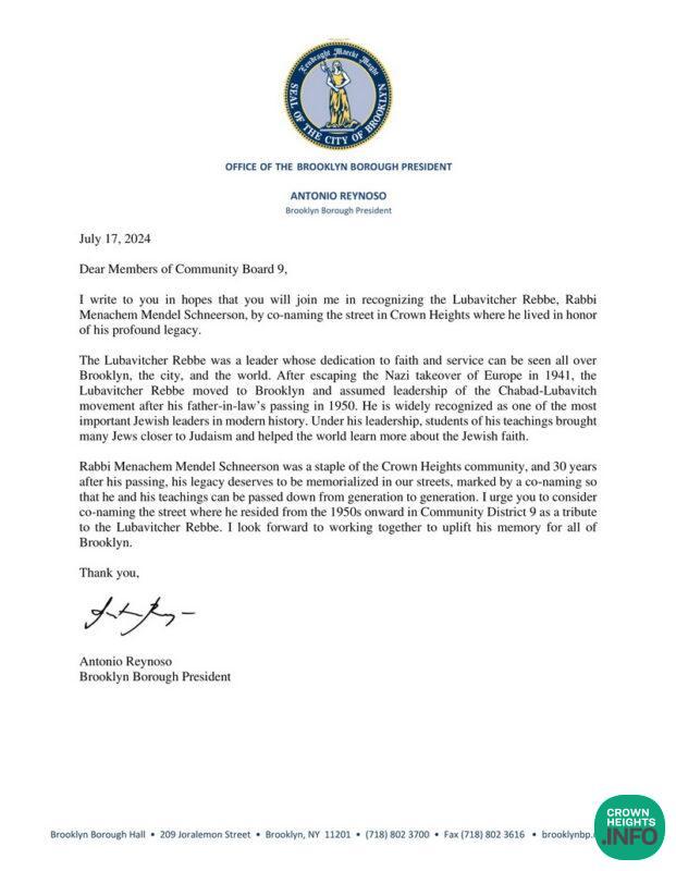 Brooklyn Borough President Antonio Reynoso stated, “He is widely recognized as one of the most important Jewish leaders in modern history. Under his leadership, his teachings brought many closer to Judaism and helped the world learn more about the Jewish faith. I urge you to consider co-naming the street where he resided.”