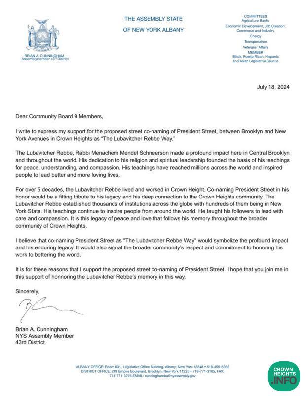 Assembly Member Brian A. Cunningham of the 43rd District noted the Rebbe’s global influence and his establishment of numerous institutions, many in New York State. “His legacy of peace and love remains a guiding force in the Crown Heights community.”