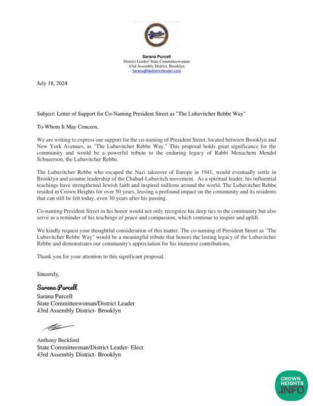 Sarana Purcell, State Committeewoman/District Leader, and Anthony Beckford, State Committeeman/District Leader-Elect, added that co-naming the street would honor the Rebbe’s deep ties to the community and his teachings of peace and compassion.