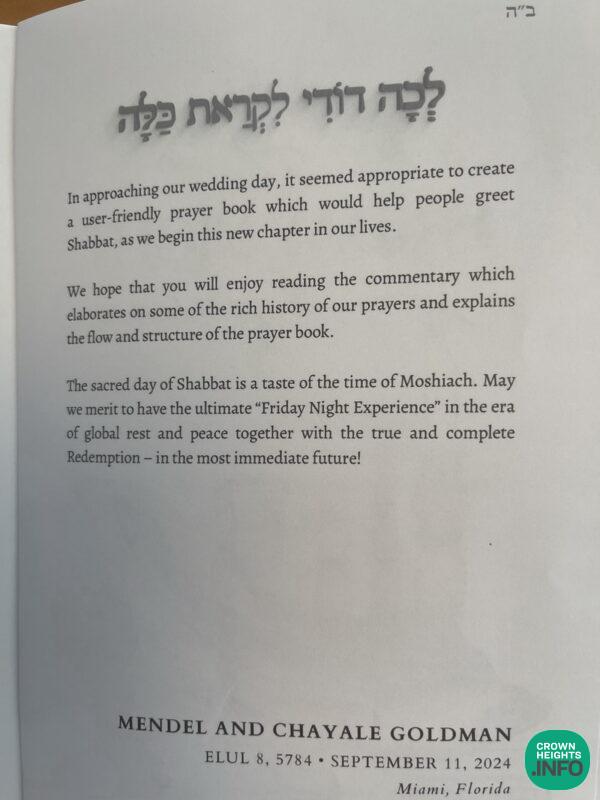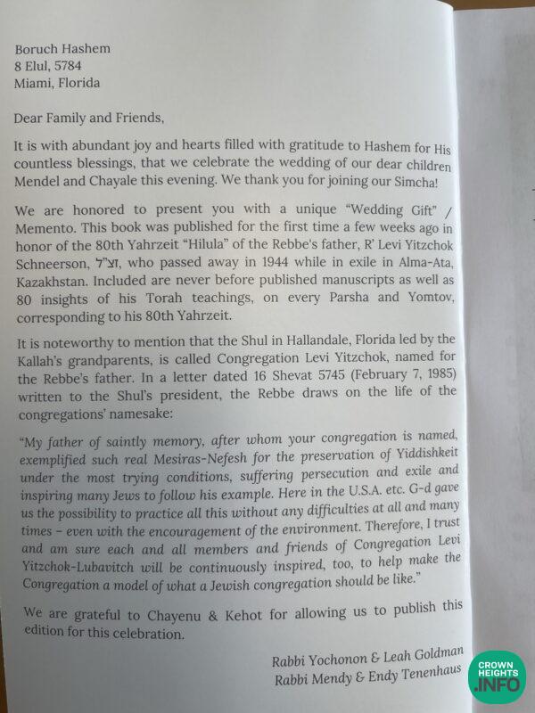At the Wednesday night wedding of Mendel and Chayale Goldman (Tennenhaus), that took place in Miami, three Teshuras (Mementos) were distributed to the guests.