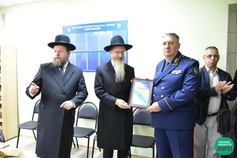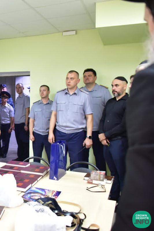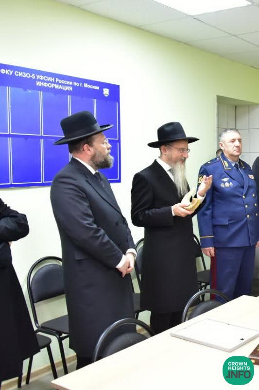 Federal Prison Chief Sergey Moroz, the prison warden Ilya Aristov, and his deputies awaited the arrival of the Chief Rabbi of Russia, Rabbi Berel Lazar, who was received with an honor guard of local officers. After a general tour of the facility and its different sections, the guests were brought to the new shul, where some of the Jewish inmates were already waiting. They laid tefillin and davened. After the first group finished, a second group of inmates from another wing was brought in.