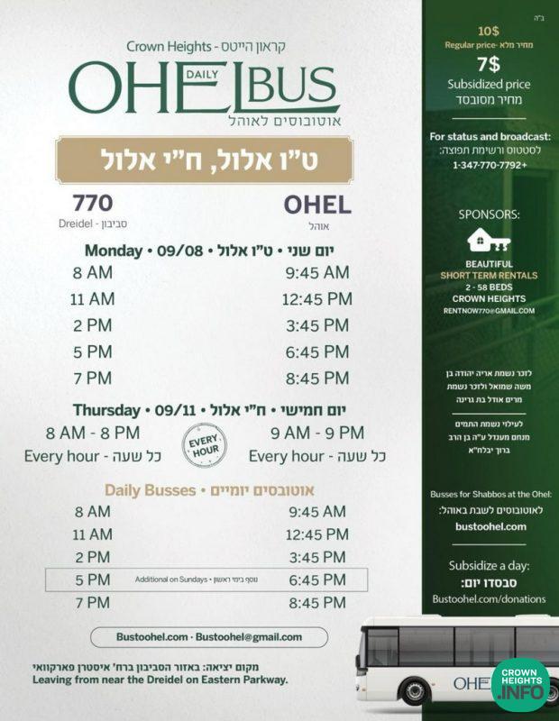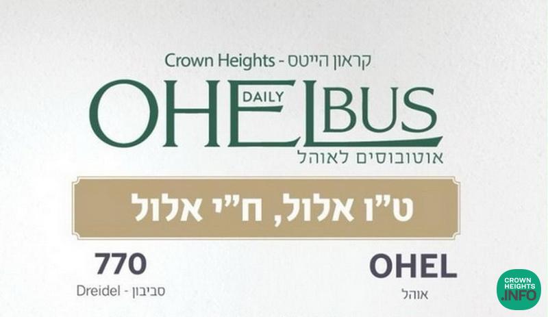 For the auspicious days of Tes Vov and Chai Elul, the Ohel Bus Service will be providing extra subsidized transportation round-trip from Crown Heights to the Ohel on Monday, Tes Vov Elul, and Thursday, Chai Elul.