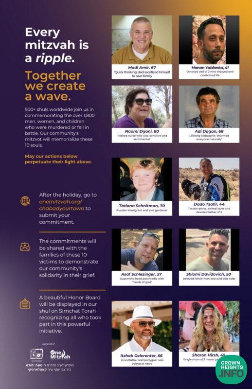 Project 10.7 offers a simple yet powerful solution. Each participating community is assigned 10 kedoshim, and community members are invited to take on one of 10 Mivtzoim in their honor. These mitzvot can be performed either 7 times or for 7 days, creating a lasting ripple of positive action in memory of those lost.