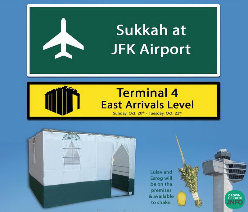 We are pleased to announce that once again passengers at JFK Airport this Chol Hamoed will be able to take advantage of a Sukkah on the way to their flights. The Sukkah is a project of Chabad of the Airport, which has been dedicated to serving the needs of Jewish travelers at New York’s airports for more than 50 years.