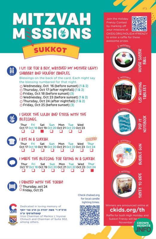 Amra from Toronto raced to add all her missions as soon as Rosh Hashana was over. Some of the missions included lighting Shabbat and holiday candles, listening to the shofar, and eating a new fruit. Noam from Maryland decided to wait till after Yom Kippur before adding in his missions, to include the mission, “I did teshuva” in his entry. But they’re not the only ones. Since Rosh Hashana, missions from the Rosh Hashanah and Yom Kippur Frenzy have flooded CKids headquarters from every corner of the globe. From bustling cities to rural communities, Shluchim across 25 states and 10 countries are seeing the excitement grow amongst their students. This contest is a round-the-clock affair with submissions coming in at all hours from excited kids—sometimes even in the wee hours of the morning, well past their bedtime! Not only are they excited about completing their missions, they are also looking forward to the Grand Raffle, happening at the end of the Sukkot Frenzy.