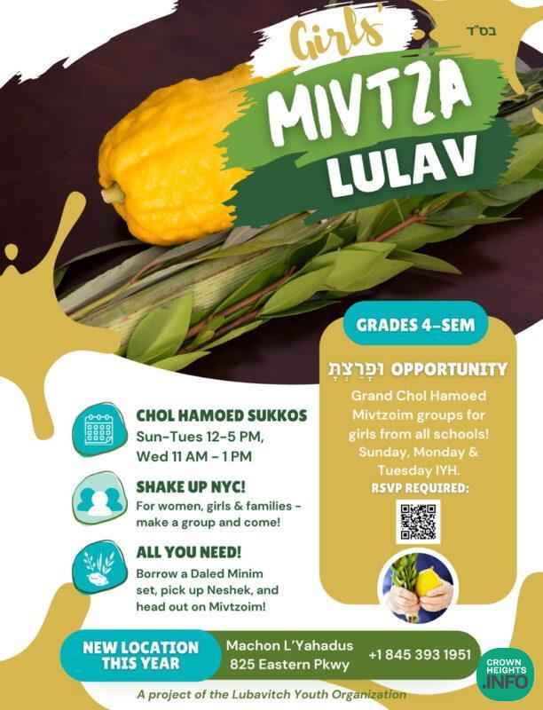 As in past years, the Girls’ Mivtza Lulav Center will be open this Chol Hamoed, making Mivtzoim supplies available for girls, women, and families. Locals and guests are encouraged to get involved!
