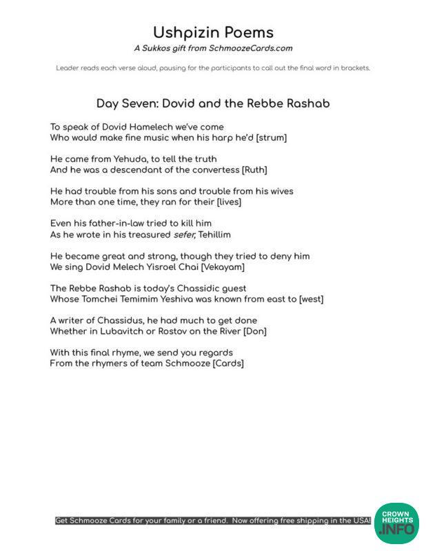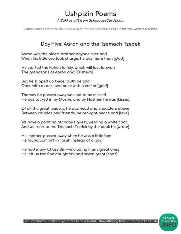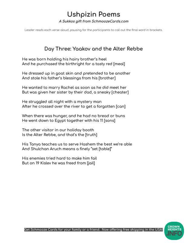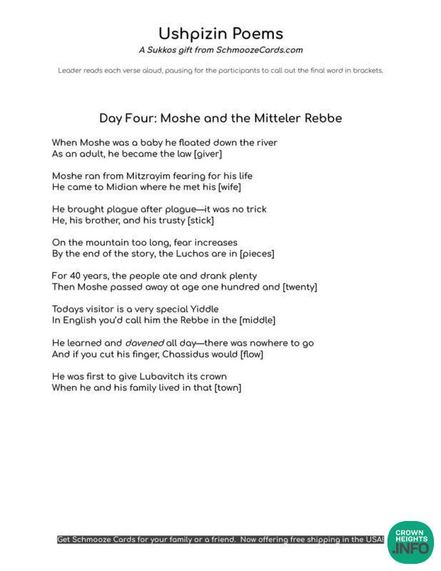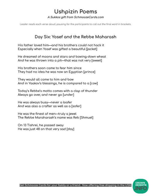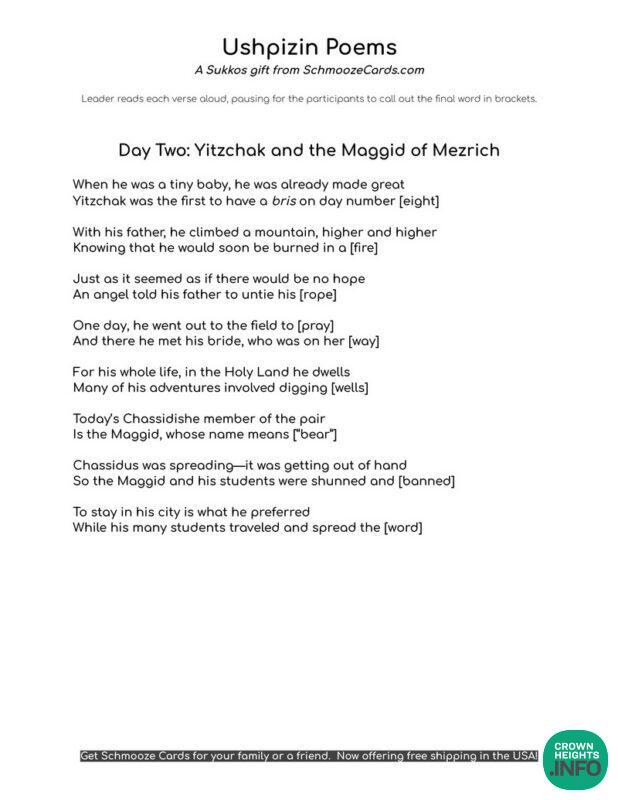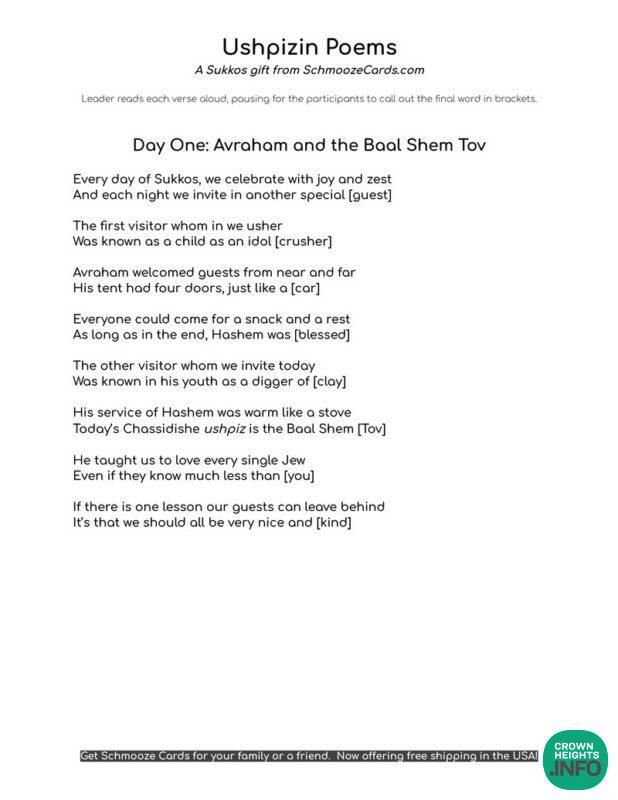 We present an enjoyable activity for children that can be printed for each each day of Sukkos. The activity includes a poem each day for that day’s ushpizin. The trick is that each line has a spot for the reader to pause and the kids, (and adults), can call out the next word.