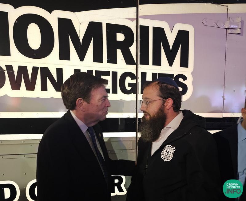 Sukkah hopping with other top brass through Crown Heights, NYPD Commissioner Thomas G. Donlon made a stop at the Crown Heights Shomrim command post at Simchas Bais Hashoeva. He heard from Crown Heights Shomrim Coordinator Rabbi Mendy Hershkop on what Shomrim does and how they help the community.