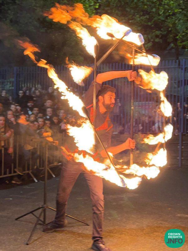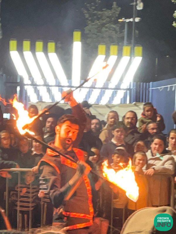 The evening featured an exciting fire show that captivated the audience, along with live music from renowned artists Meni Dubrawsky and Avrumy Rosenbaum, who kept the energy high throughout the night. Children were treated to special gifts, adding to the festive atmosphere and ensuring that families enjoyed a memorable experience together.