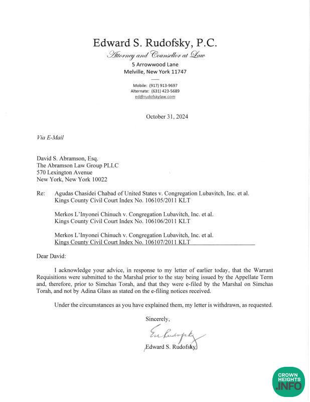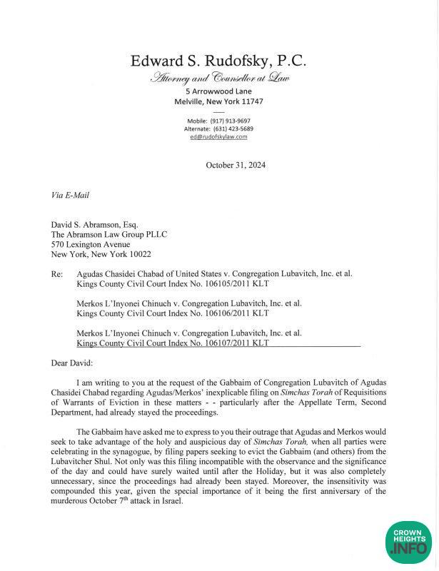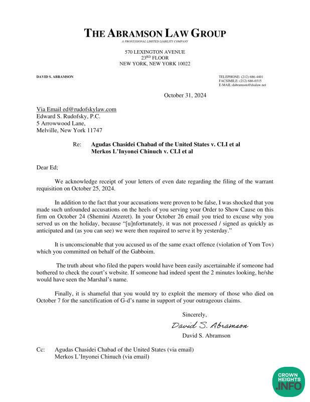 In a letter dated October 31st, the lawyer for the Gabboim wrote to the court lambasting Agudas Chasidei Chabad for filing the warrant, claiming that the previous win in court had been stayed pending yet another appeal. The letter also slams Aguch for filing on Yom Tov, a sacred day they claim made even more special as it marks a year from Hamas’s attack on the State of Israel and the Jewish people.