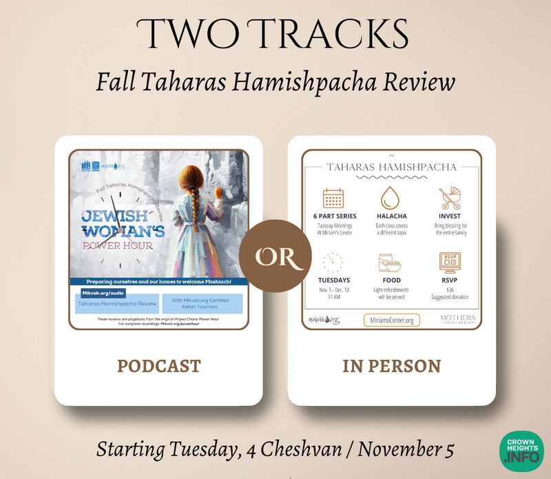 As per the Rebbe’s call to action, to review Taharas Hamishpacha halachos every year, Mikvah.org is excited to present two ways to go about it. Starting this week and continuing for six weeks, you can join an online review course or attend an in-person session: