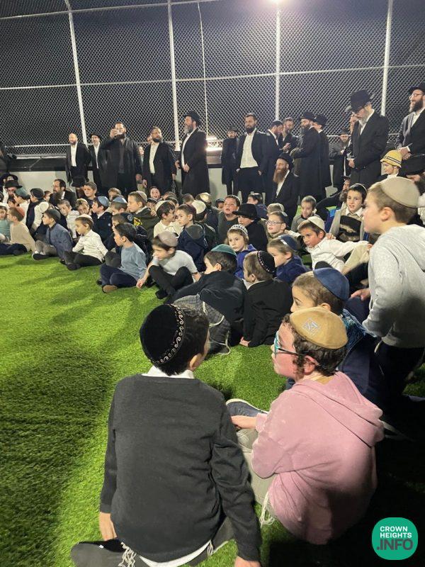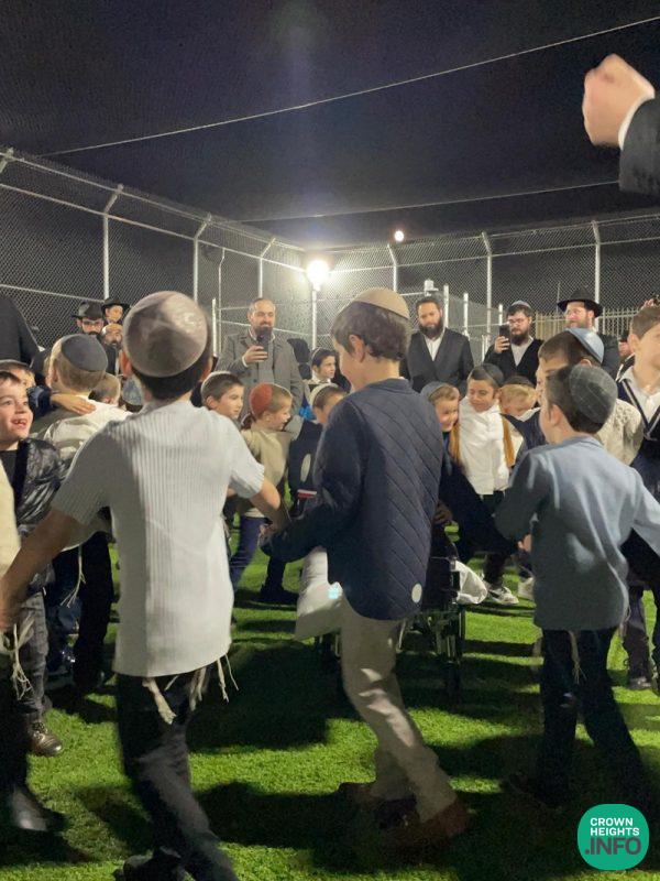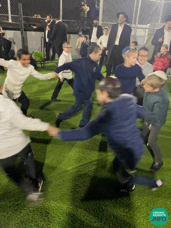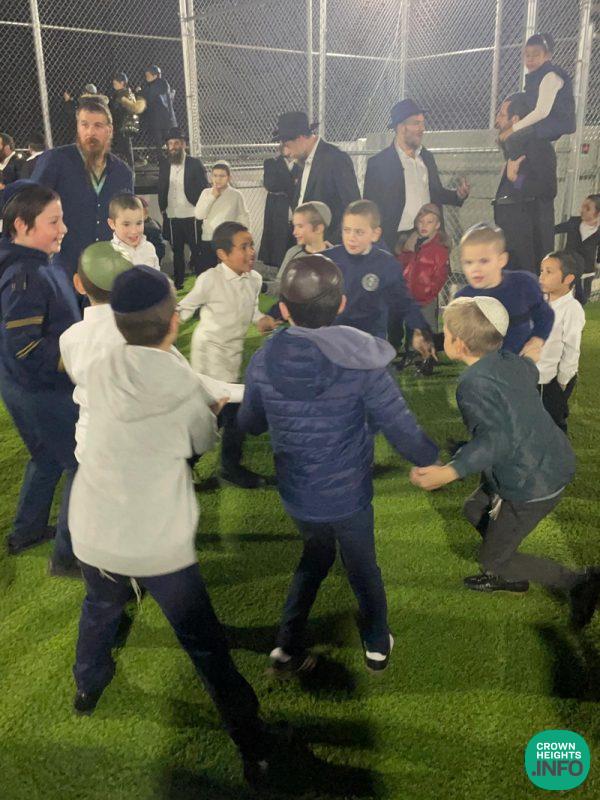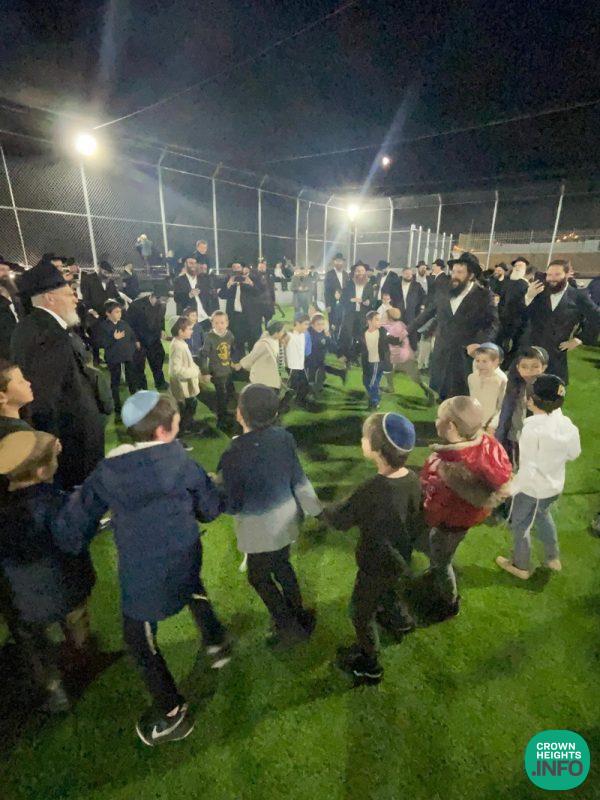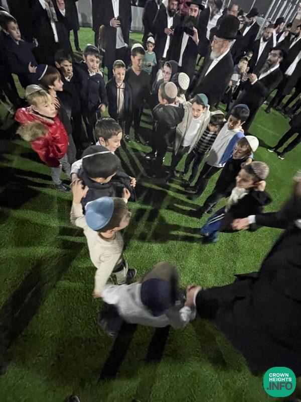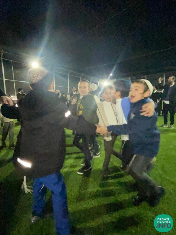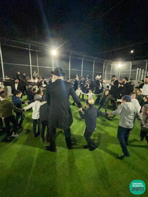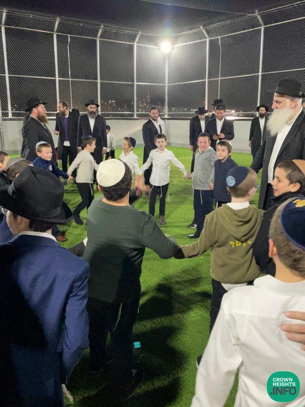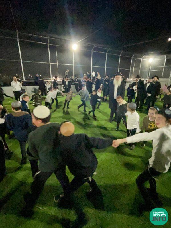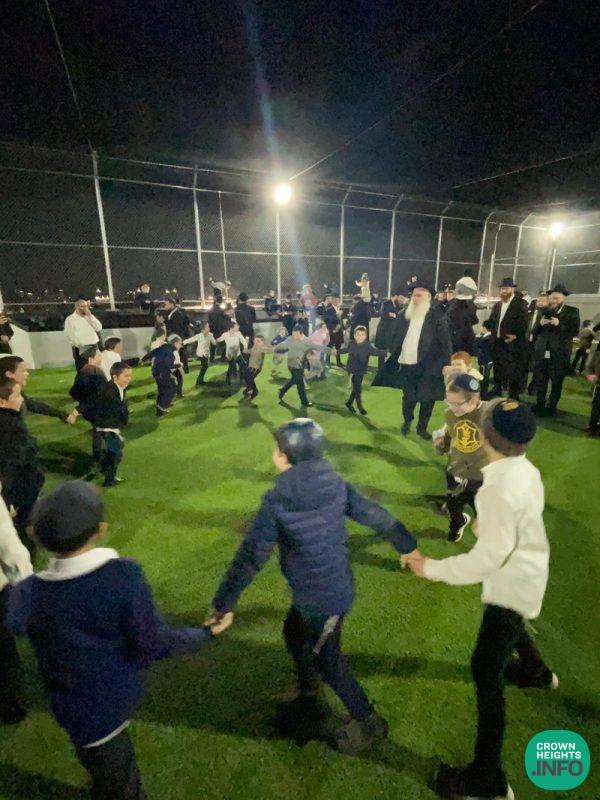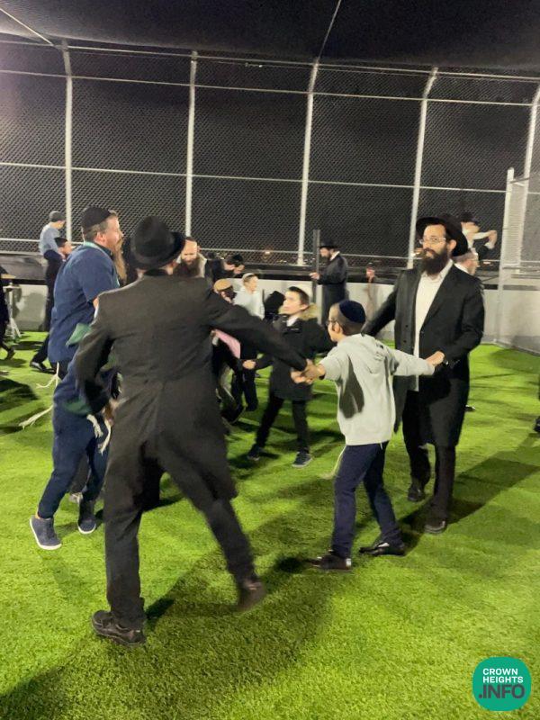 Talmidim of Lubavitcher Yeshiva, along with their fathers and grandfathers, danced in a manner of pure joy on the rooftop of their Yeshiva campus on Crown Street.