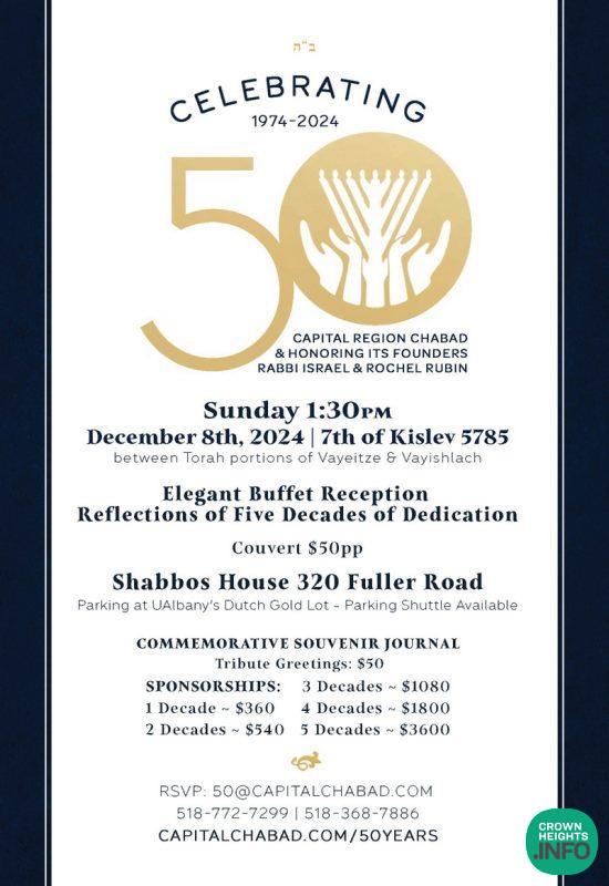 The Capital Region of Northeast NY State will be celebrating 50 years (1974-2024) since the arrival of Rabbi Yisroel and Rochel Rubin as the Rebbe’s Shluchim to Albany, establishing Chabad of NY’s Capital Region. Since then, a day-school was established and continues to thrive (which Morah Rochel Rubin continues to lead), there are a dozen Shluchim and Chabad Centers in the immediate Capital Region area, and many more Shluchim throughout the Hudson Valley and Eastern NY State.