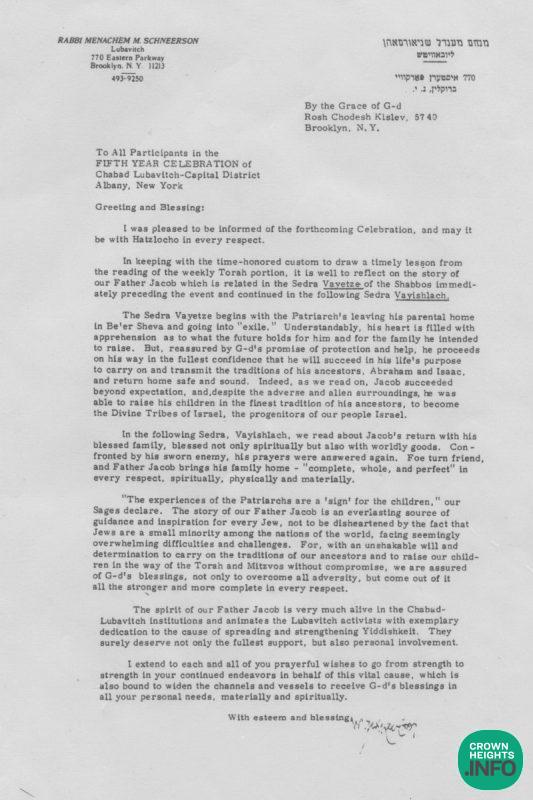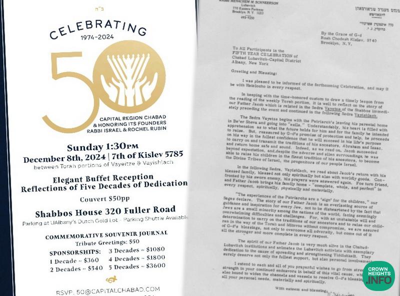 A 50 Year Jubilee celebration will take place on Sunday (December 8th ) between Vayeitzei and Vayishlach. The date is significant as the Rebbe sent a special letter, in honor of the 5th year celebration, that describes the difference of Yaakov “leaving his parental home… heart full of apprehension” in Vayeitzei, but returning home in Vayishlach blessed “complete, whole and perfect in every respect, spiritually, physically, and materially”. The Rebbe applies this to the Chabad emissaries as “the spirit of our father Jacob is very much alive in Chabad-Lubavitch institutions and animates the Lubavitch activists with exemplary dedication…” This Rebbe letter is affectionately known in Albany as “the Vayeitzei-Vayishlach letter” and is read each year as if it was sent by the Rebbe anew. This 50 Year celebration takes place exactly 45 years from that letter and its promises and blessings are amply fulfilled and continue to be realized. May we continue to see the blessings ten-fold as we now celebrate 50 years.