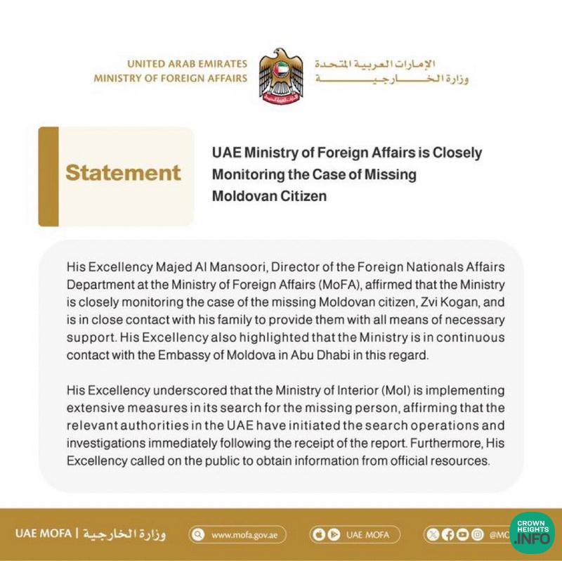 The Foreign Ministry of the United Arab Emirates has released its first statement following Kogan’s disappearance. In addition to Mossad, the UAE Ministry of Interior is participating in the Search for Kogan.