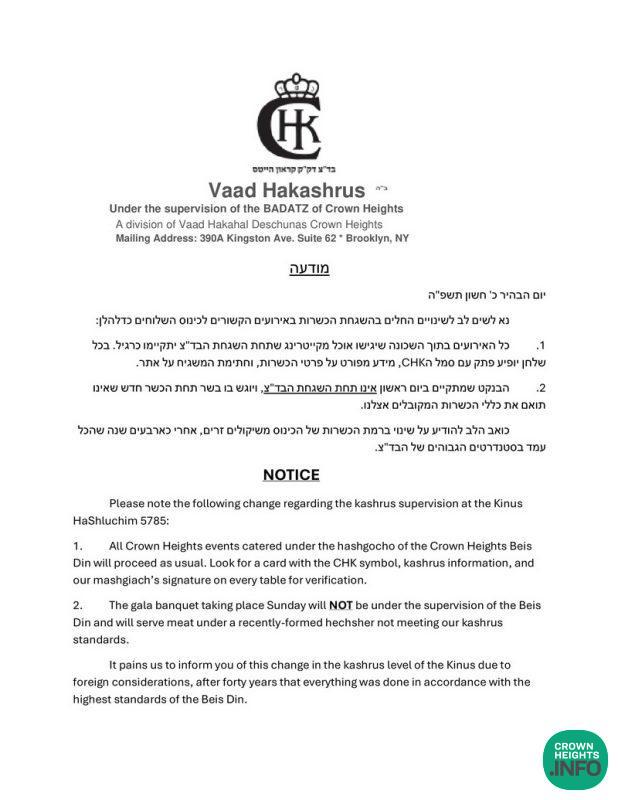 “The gala banquet taking place Sunday will NOT be under the supervision of the Beis Din and will serve meat under a recently-formed hechsher not meeting our kashrus standards,” the CHK wrote in their statement. “It pains us to inform you of this change in the kashrus level of the Kinus due to foreign considerations, after forty years that everything was done in accordance with the highest standards of the Beis Din.”