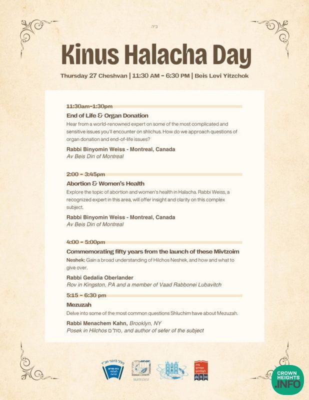 The Practical Rabbinics – Halacha Summit’s four sessions will run from 11:30 a.m. to 6:30 p.m. at Beis Levi Yitzchak in Crown Heights and address several complex questions shluchim inevitably encounter, from the sensitive issues of Abortion and Organ donation to learning about the halachos of Neshek and Mezuzah, as we mark 50 years since these mivtzoim began.