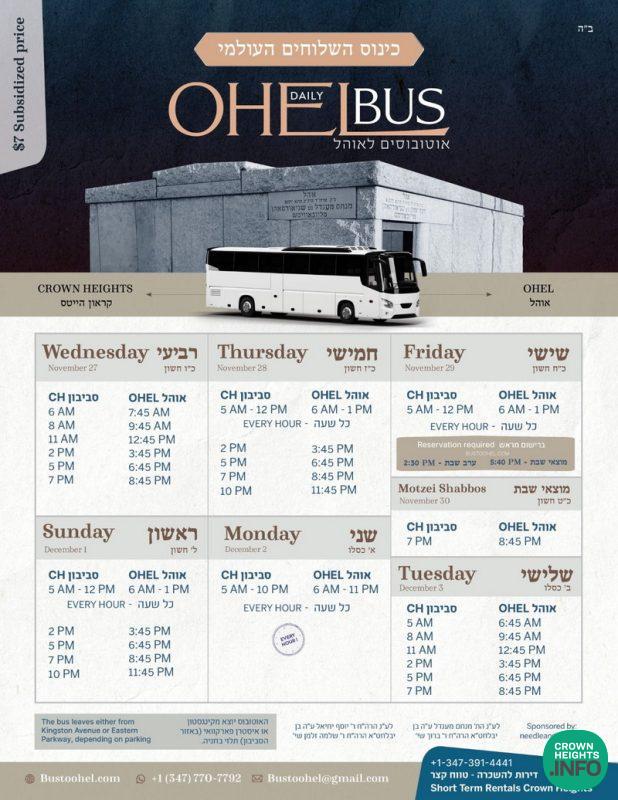 With thousands of Shluchim descending on Crown Heights for the International Kius Hashluchim, the Ohel Bus Service will be providing extra subsidized transportation round trip from Crown Heights to the Ohel from Wednesday, November 27th, through Tuesday, December 3rd.