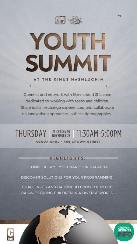 The Youth Summit at the Kinus Hashluchim will take place at Aguda Shul – 456 Crown Street, on Thursday 27 Cheshvan November 28, from 11:30AM-12:30PM.