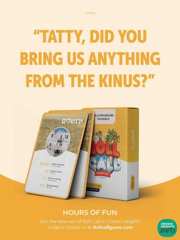 It’s a brand new game for kids, and it’s stirring up a little friendly competition among Shluchim. The game – aptly dubbed Roll Call – is offering kids some exciting, screen-free entertainment while they learn all about Chabad’s presence around the world.