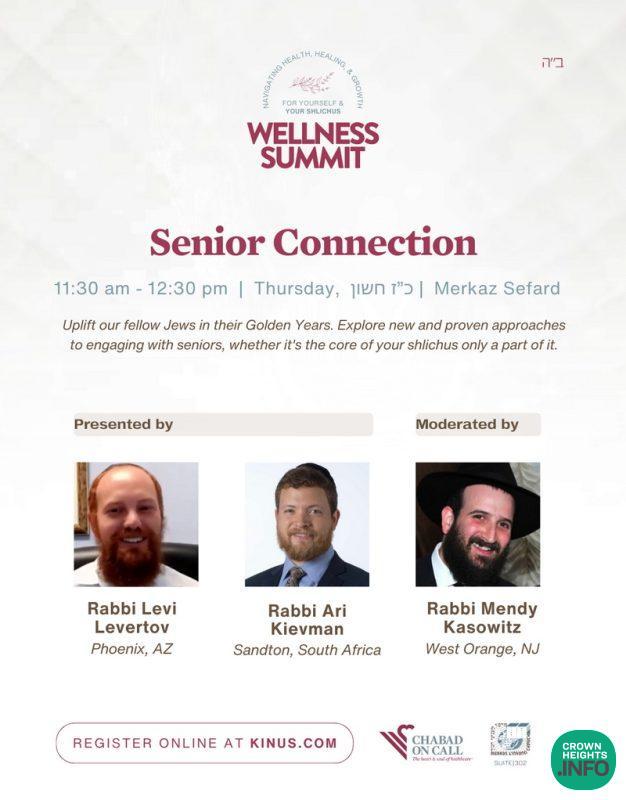 At the full-day program, Rabbi Levi Levertov of Downtown Phoenix, AZ, and Rabbi Ari Kievman of Sandton, SA will discuss effective outreach strategies for seniors in various living situations. Rabbi Mendy Kasowitz of West Orange, NJ, who helped shape the summit’s content, will moderate this first session of the day.