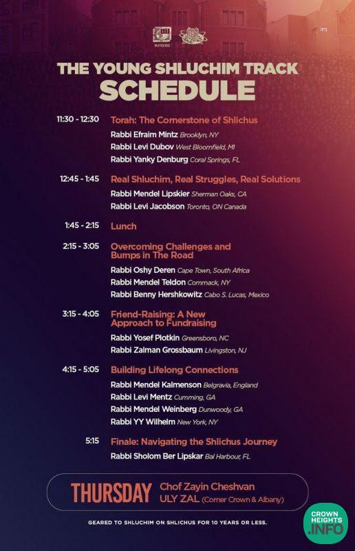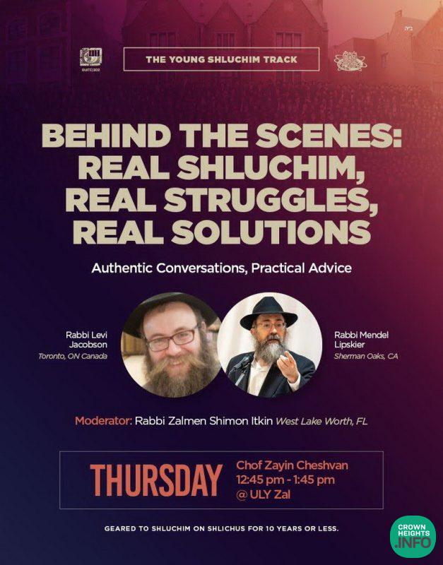 Following that, “Behind the Scenes: Real Shluchim, Real Struggles, Real Solutions” offers an authentic conversation moderated by Rabbi Zalmen Shimon Itkin of West Lake Worth, Florida. Rabbis Mendel Lipskier from Sherman Oaks, California, and Levi Jacobson of Toronto, Canada, will provide practical advice rooted in real-life challenges.