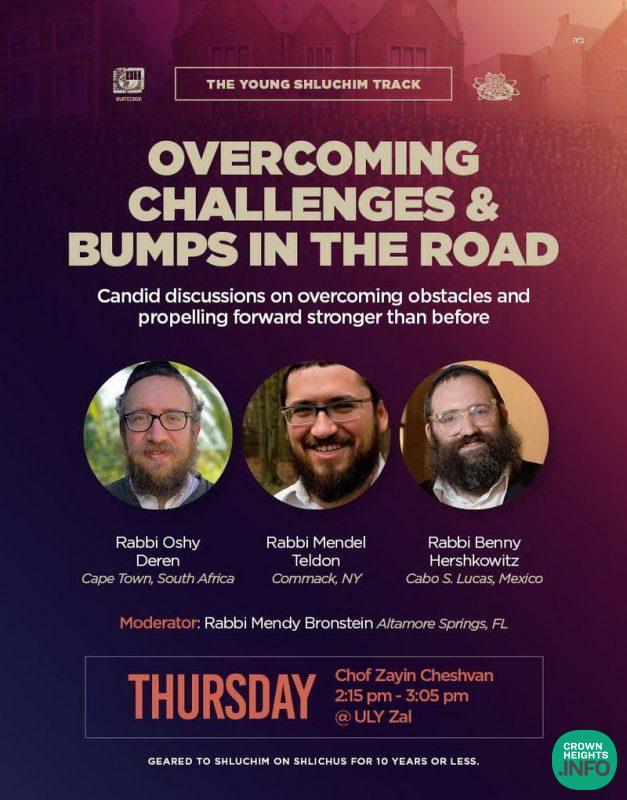 The afternoon sessions delve deeper into the realities of shlichus. “Overcoming Challenges and Bumps in the Road” features Rabbis Oshy Deren of Cape Town, South Africa, Mendel Teldon of Commack, New York, and Benny Hershkowitz of Cabo San Lucas, Mexico. They will discuss resilience and growth in the face of obstacles.