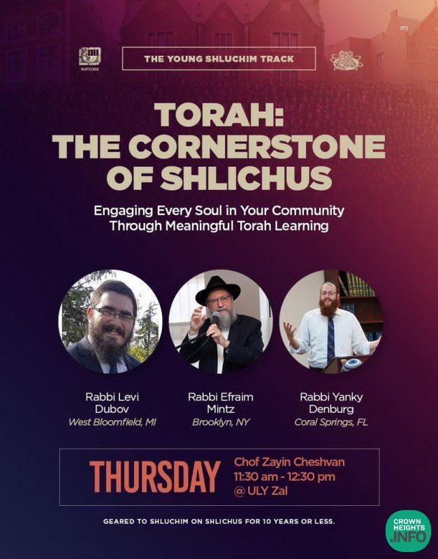 The day begins with “Torah: The Cornerstone of Shlichus,” a session dedicated to engaging every soul in the community through meaningful Torah learning. Rabbis Efraim Mintz of Brooklyn, New York, Yankie Denburg of Coral Springs, Florida, and Levi Dubov of Bloomfield Hills, Michigan, will share insights and strategies drawn from their own experiences.