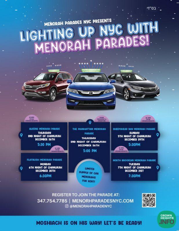 Following the success and positive feedback from last year’s initiative, Crown Heights families once again have 5 Car Menorah Parade options to choose from!