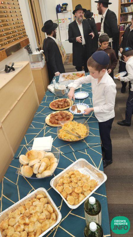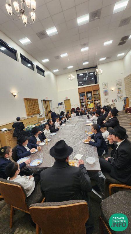 After the regular learning time for each father with their children, the participants watched an extended clip of a Yud Tes Kislev Farbrengen with the Rebbe. They then partook of a catered buffet and sat down to a farbrengen that included stories and divrei hisoirerus from many of the Shluchim present.