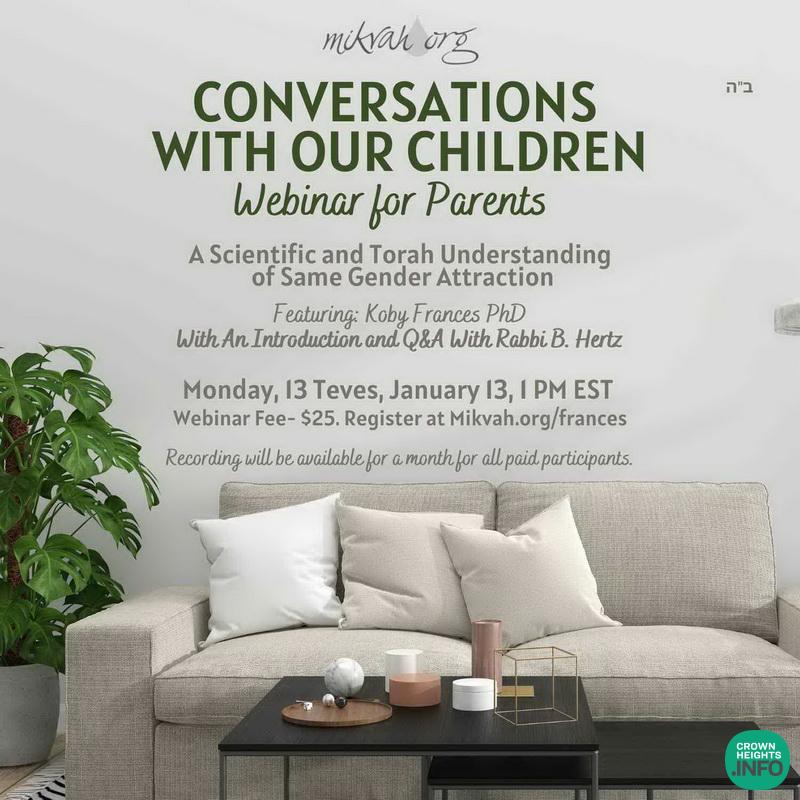 To help parents navigate these discussions, Mikvah.org is hosting a webinar titled “Conversations with Our Children: A Torah and Scientific Understanding of Same Gender Attraction.”